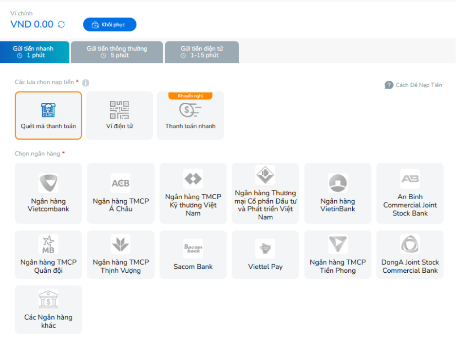 • Chuyển khoản ngân hàng: An toàn và phổ biến, bạn có thể nạp qua Internet Banking hoặc tại các điểm giao dịch ngân hàng.